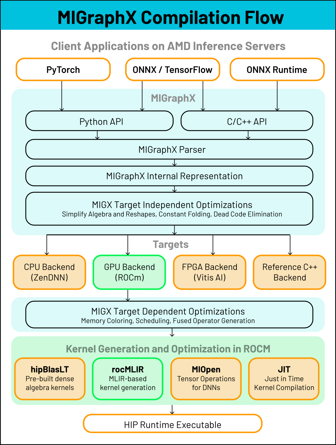 The MIGraphX deep learning (DL) compiler improves inference by analyzing a model’s compute graph and applying program transformations. After optimization, the compiler lowers graph operations to device kernels (from libraries or via code generation) for efficient execution.