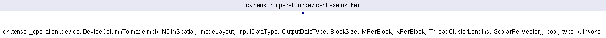 Inheritance diagram for ck::tensor_operation::device::DeviceColumnToImageImpl< NDimSpatial, ImageLayout, InputDataType, OutputDataType, BlockSize, MPerBlock, KPerBlock, ThreadClusterLengths, ScalarPerVector,, bool, type >::Invoker: