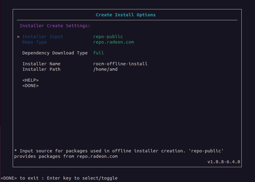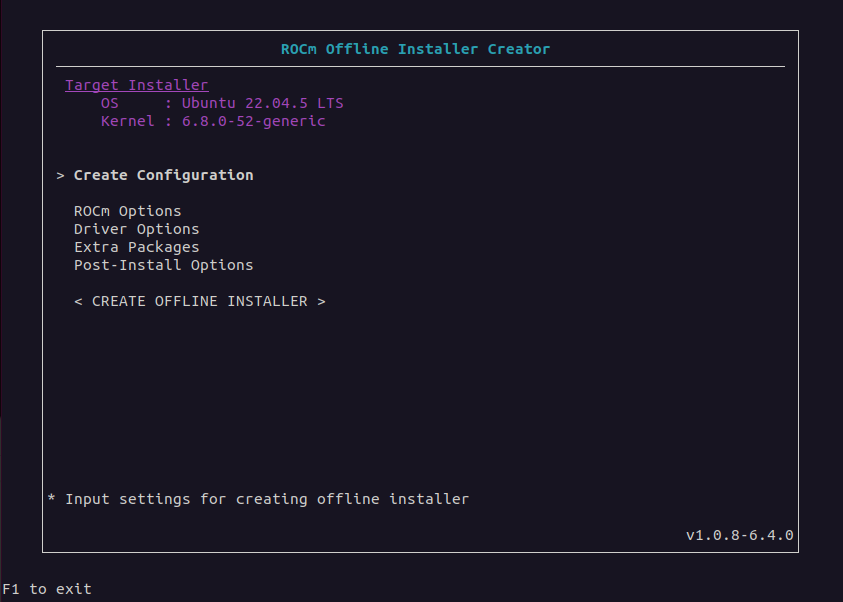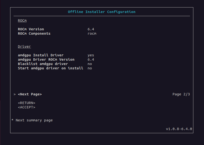 help: displays information on how to use the Offline Installer Creatorversion: displays the current version of the Offline Installer Creatorprompt: enables user prompts during offline installer creationconfig=: specifies the full path to a.configfile that contains a configuration for creating an offline installer. This parameter is used for testing purposes. See the Testing section for more information.wconfig=: specifies the full path to a.configfile that is created using the current configuration settings when the user exits the user interface. When this option is specified, the ROCm Offline Installer Creator does not create an installer package. This option is used for testing purposes.