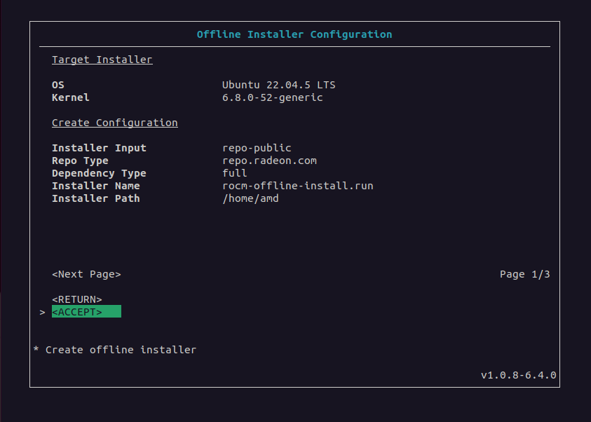 If there are no errors in the configuration, select <ACCEPT> to create the offline installer, which is saved to the designated location.