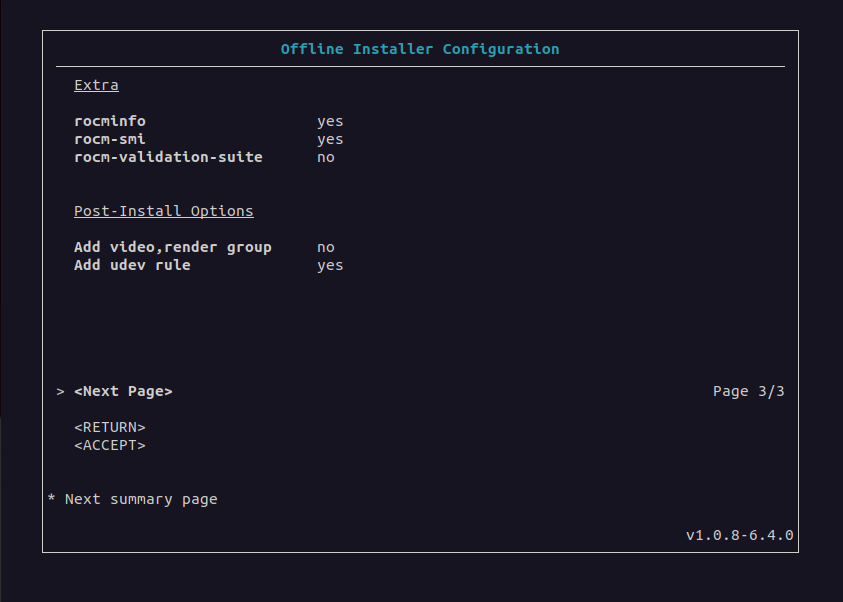 Some ROCm components already include the rocminfo and rocm-smi packages, which are automatically added to the offline installer by default. If so, the user interface sets the rocminfo and rocm-smi fields to