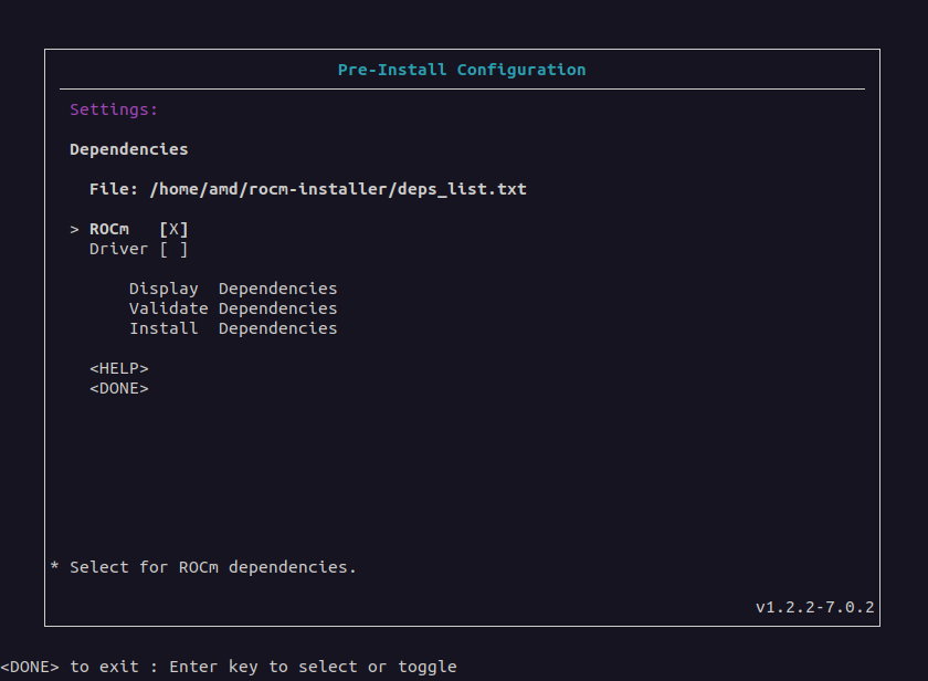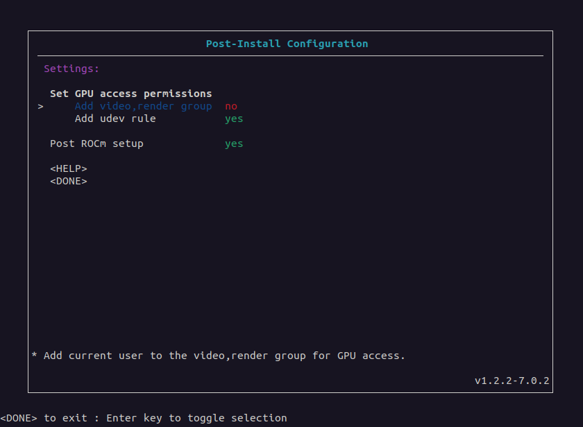 Similar to the GUI Post-Install Options menu, the post-install options can configure the ROCm Runfile Installer