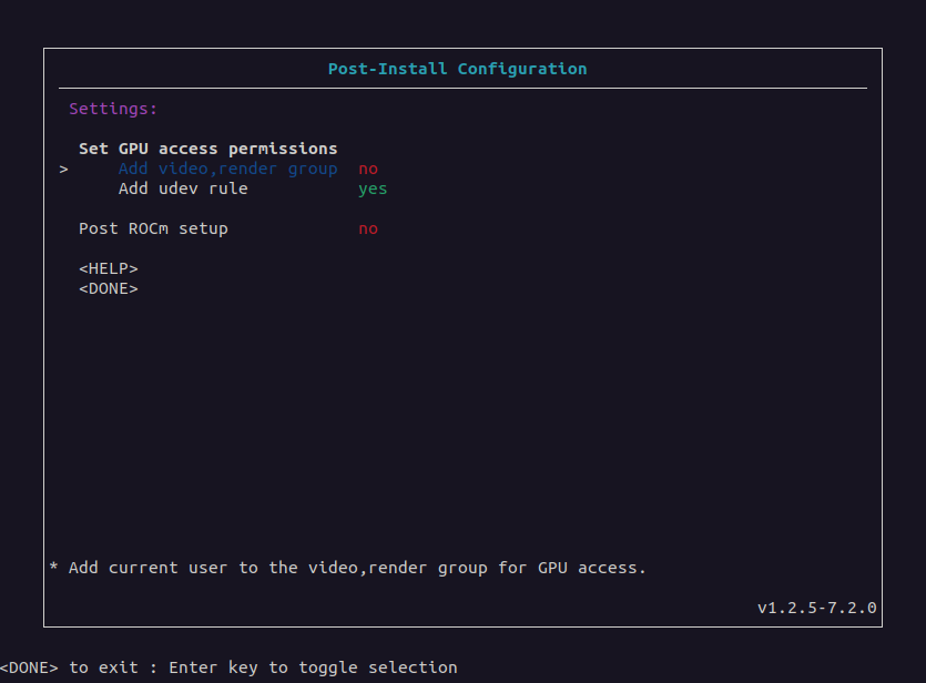 Similar to the GUI Post-Install Options menu, the post-install options can configure the ROCm Runfile Installer