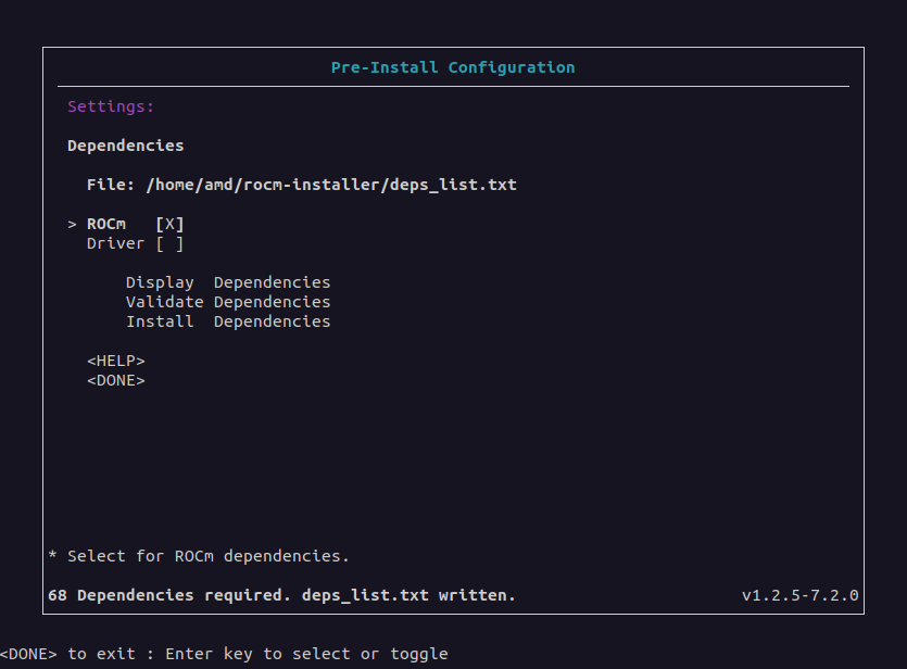 deps=listcauses the installer to quit after listing the dependencies.deps=listcan combinerocmandamdgpuand output the combined list of required dependencies.Use
