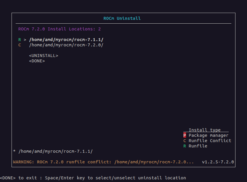 target=<directory>is optional for theuninstall-rocmoption. If it’s set, the uninstall looks for a pre-existing ROCm installation at the specified directory path and attempts to remove it.To uninstall ROCm from the default location (