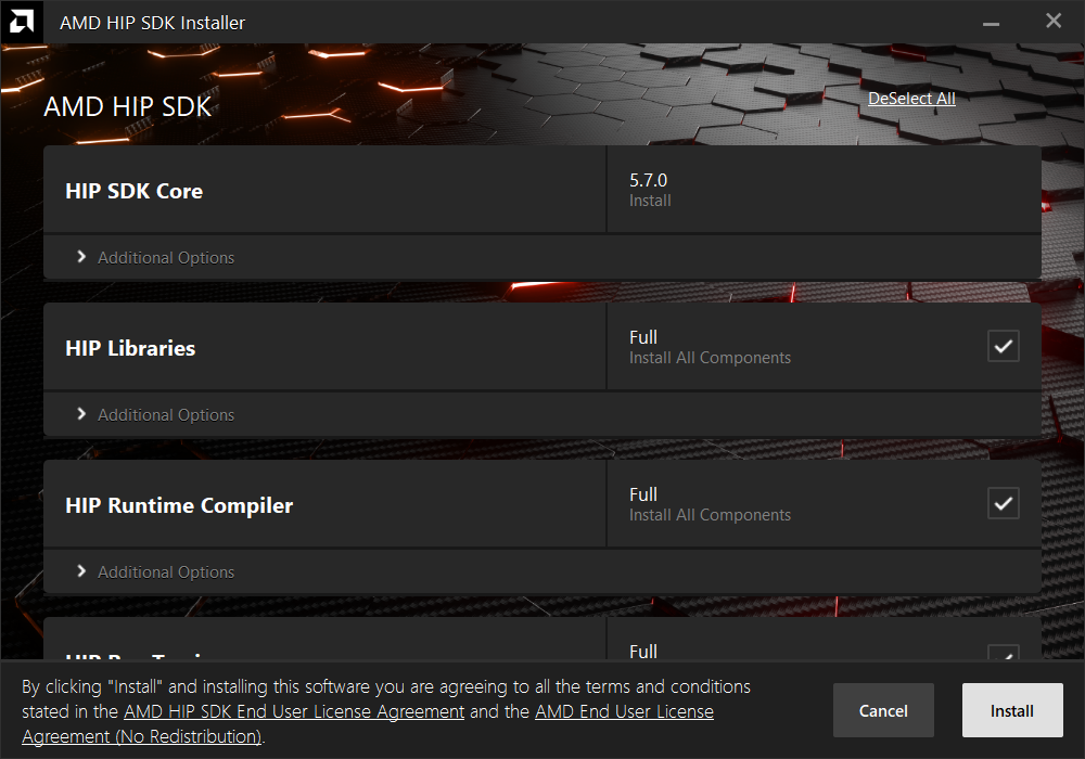 The select/deselect all options only apply to the installation of HIP SDK components. To