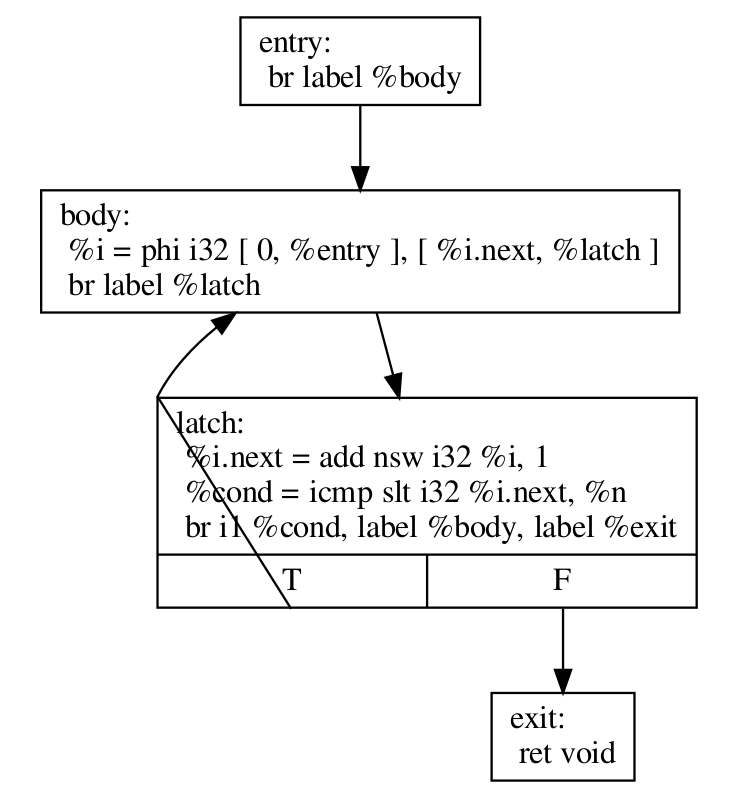 which might be represented in LLVM-IR as follows. Note that there is only a single header and hence just a single loop.