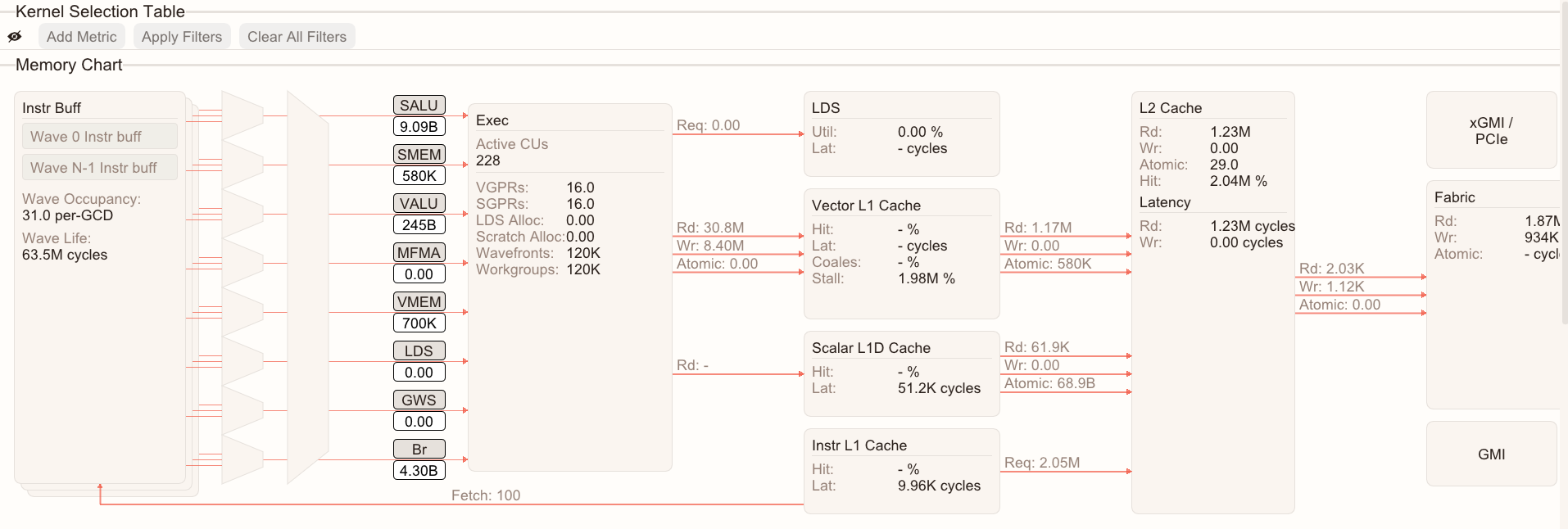Select a kernel in the Kernel Selection Table or the kernel selector drop-down to view the memory chart of the selected kernel.