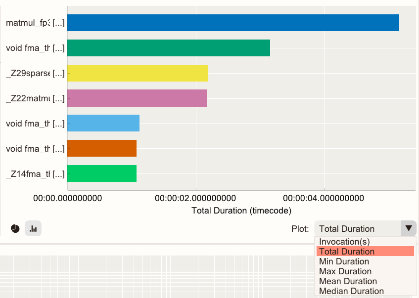 The bar chart displays per-kernel metrics including the number of invocations, and the Total, Min, Max, Mean, and Median duration data.