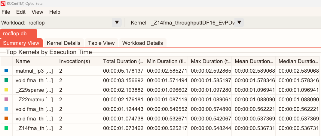 When you open a ROCm Compute Profiler analysis database file, you can view its data populated in Summary View, Kernel Details, Table View, and Workload Details.