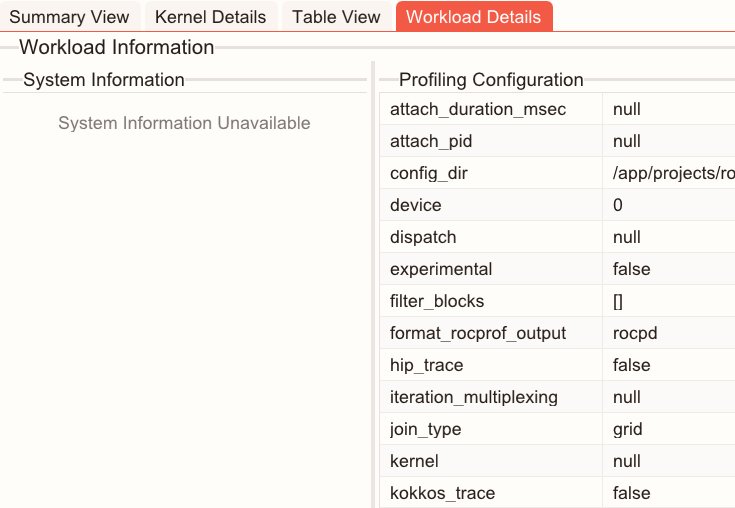 Profiling configuration: ROCm Compute Profiler parameters and settings used when the data was captured.