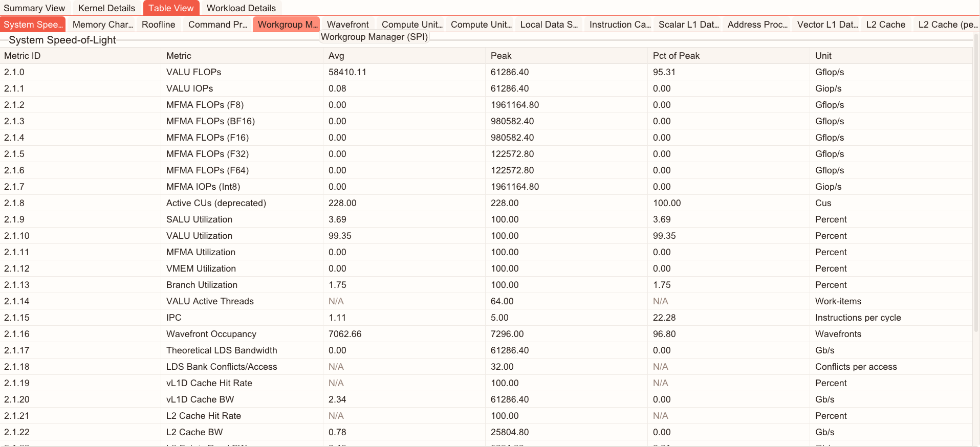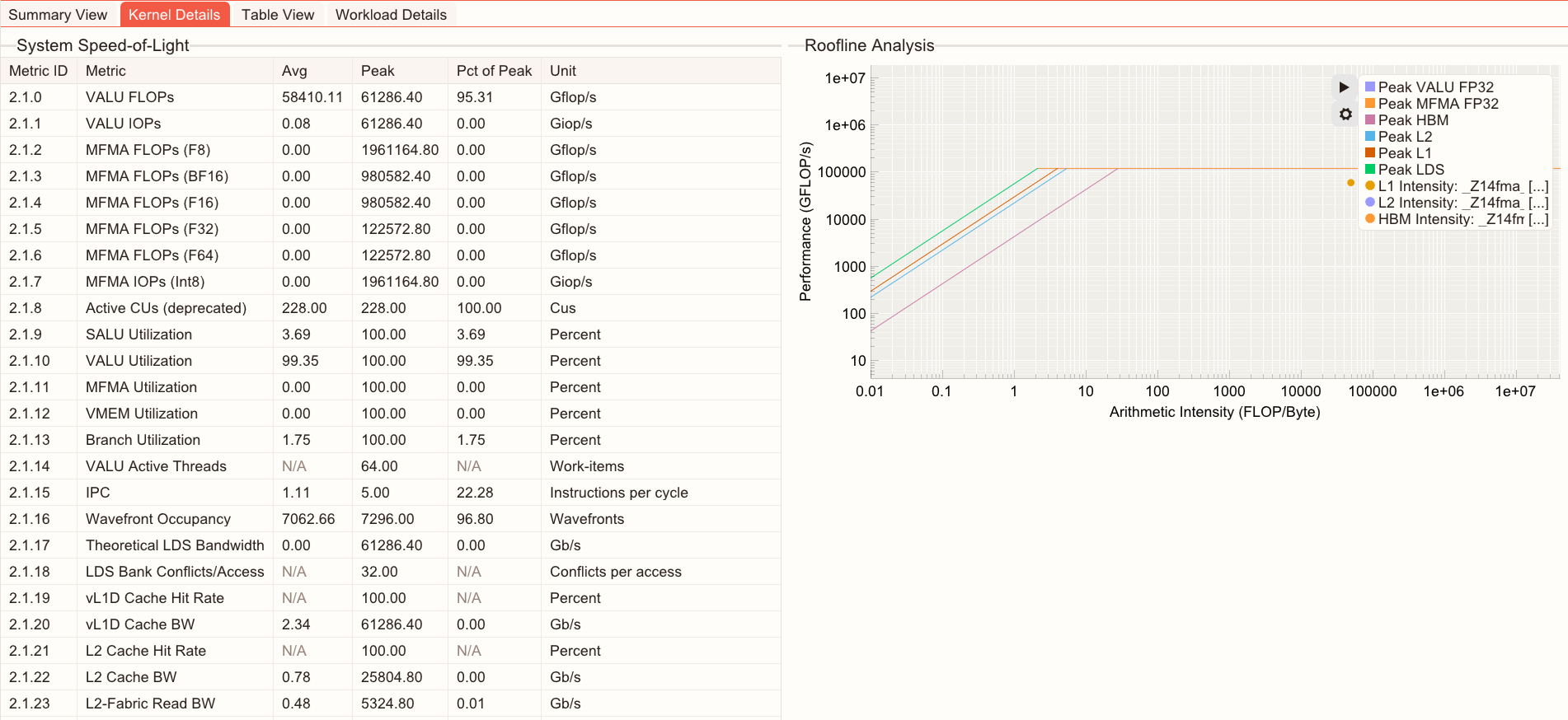System Speed-of-Light: A table view of kernel metrics with their unit, average, peak, and percentage of peak values.