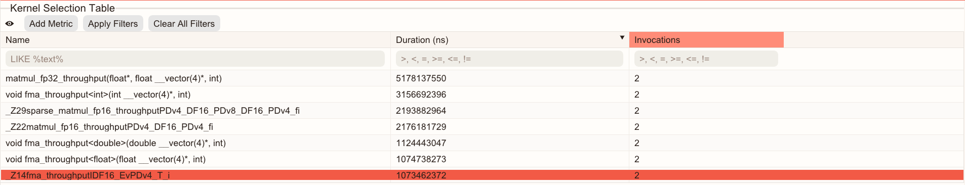 The search box below each column’s header allows you to enter statements to filter the data, enabling targeted analysis. Click Apply Filters to execute. You can search for a kernel by name or metric equation.