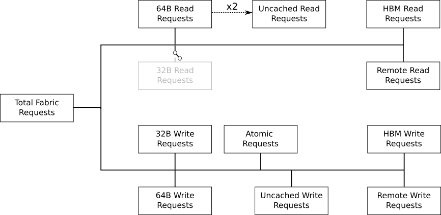 Finally, we note that uncached read requests (e.g., to fine-grained memory) are handled specially on CDNA accelerators, as indicated in the request flow diagram. These are expected to be counted as a 64B Read Request, and if they are requests to uncached memory (denoted by the dashed line), they will also be counted as two uncached read requests (that is, the request is split):