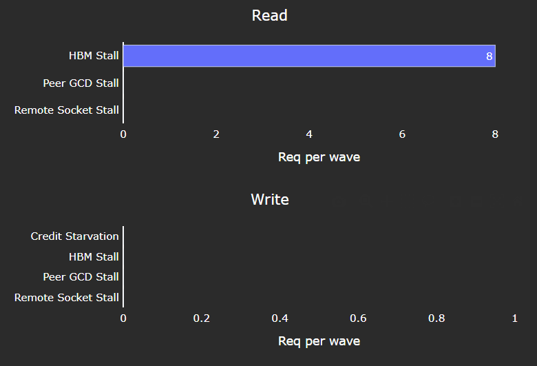 Fig. 43 A breakdown of what types of requests in a kernel caused a stall (e.g., read vs write), and to which locations (e.g., to the accelerator’s local memory, or to remote accelerators/CPUs).#