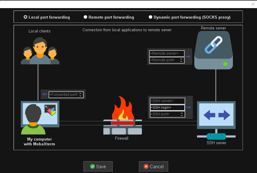 <SSH server>: name of the server to connect to<SSH login>: username to login to the server<SSH port>:22